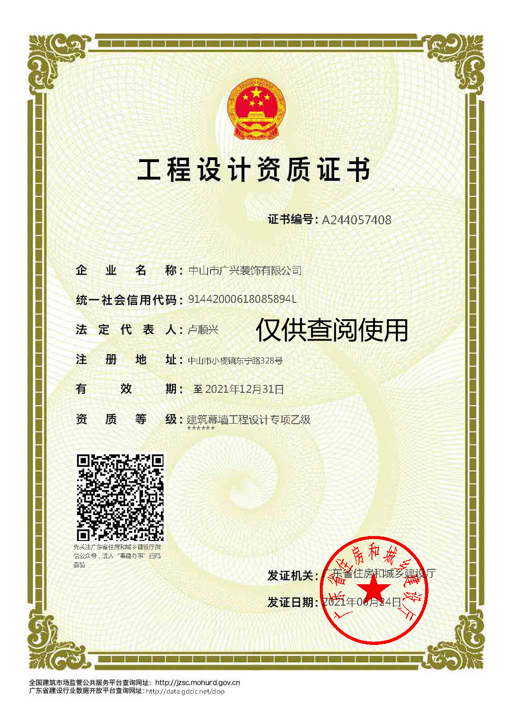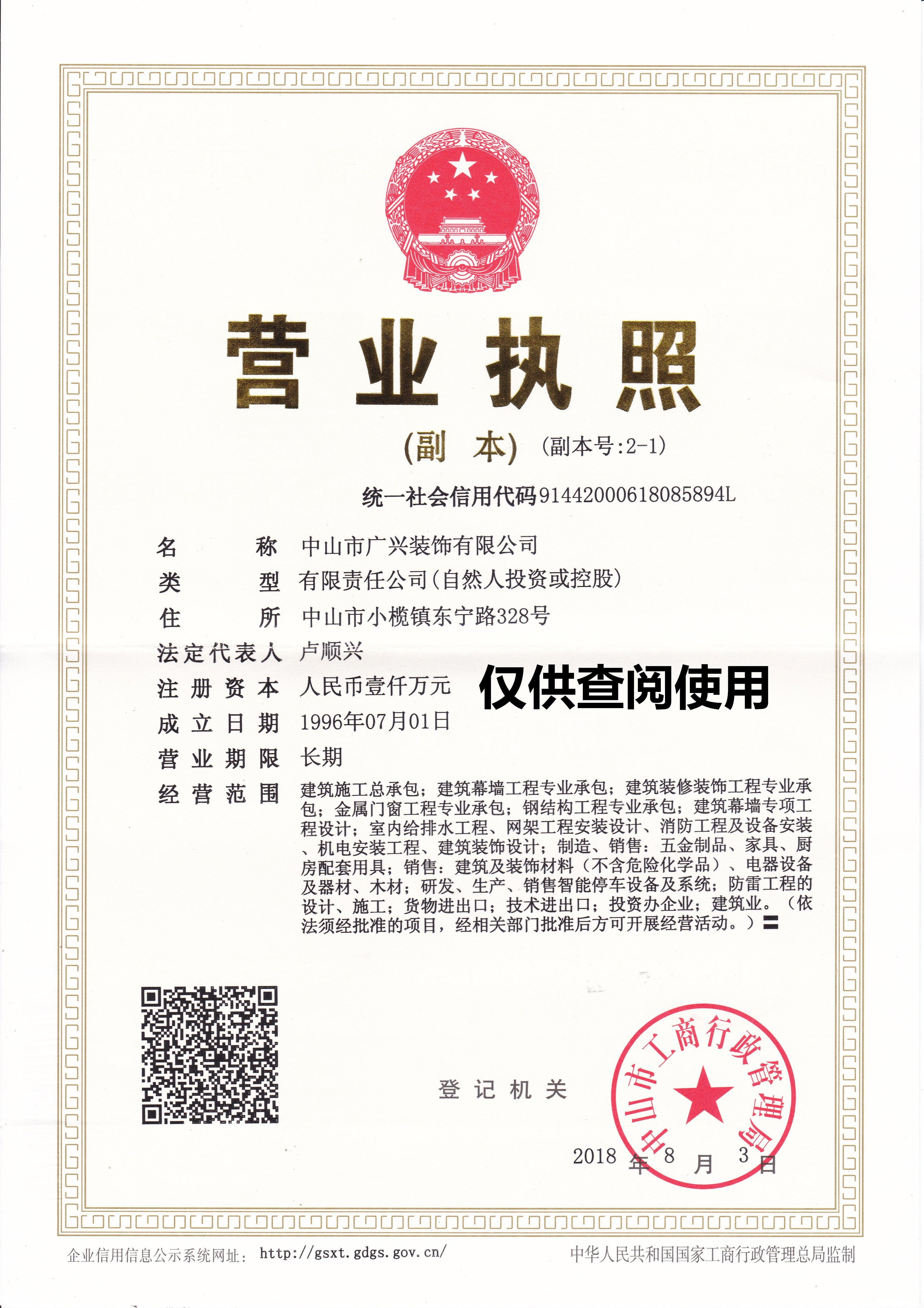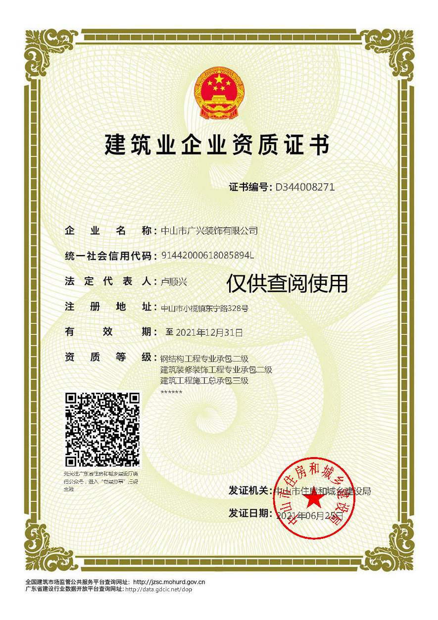 中山市廣興裝飾有限公司創建于1985年,是一家集鋼結構、建筑、幕墻、裝修裝飾、鋁合金門窗專業的設計、加工及施工安裝為一體的大型綜合性建筑企業。公司總部位于中山市小欖鎮,在中山和珠海均建有生產加工基地,總占地面積60000多平方米。